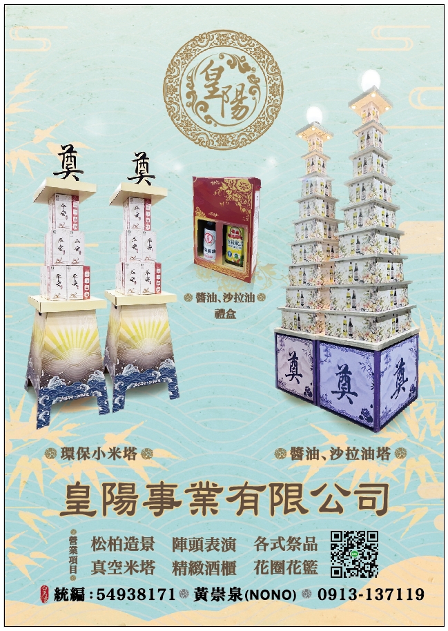 廣告贊助商 寶華山生命紀念館 寶華山生命紀念館 大溪永福金寶塔(和平禪寺) 昌帝文創國際有限公司 奠品藝術創意企業社 御奠園淨界紀念會館 Les nuages拉諾彩虹 一天山生命紀念館 震溪龍獅民俗技藝團 皇陽事業有限公司 星磐企業有限公司 龍福木業有限公司 123