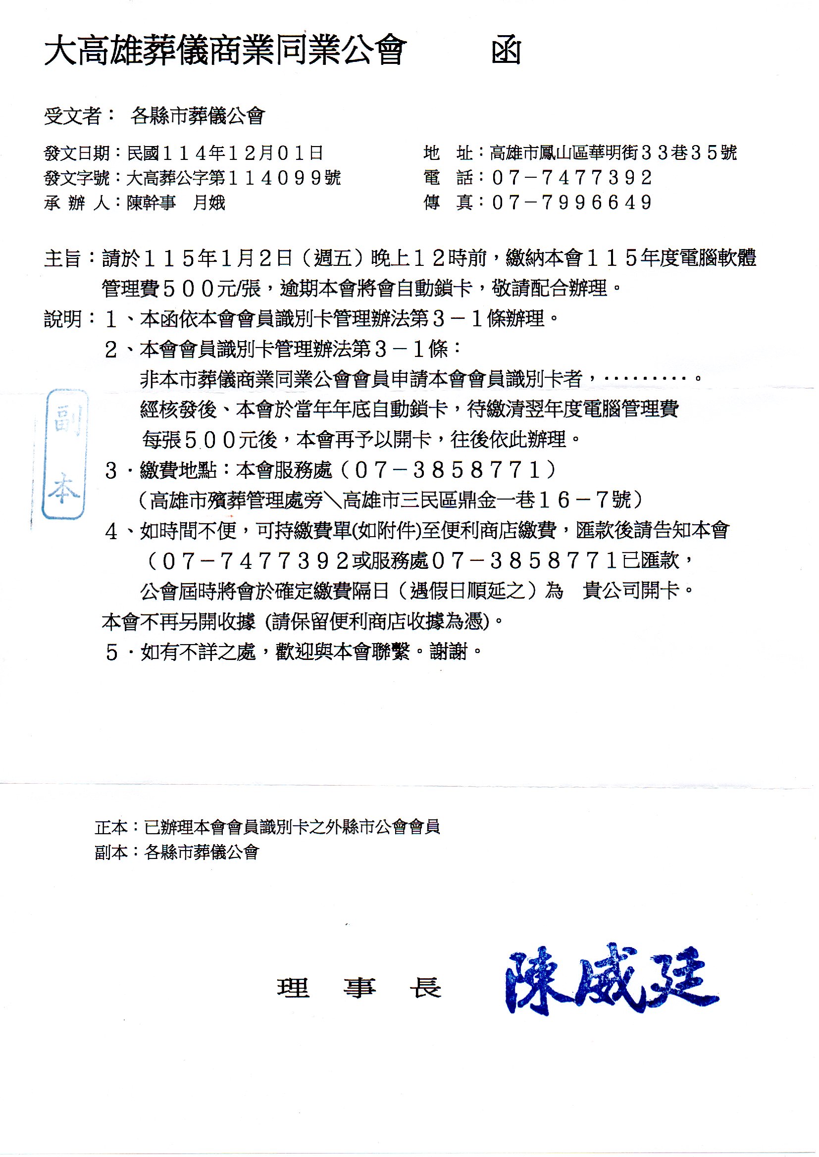 有關大高雄葬儀商業同業公會115年度會員識別卡電腦軟體管理費續約事宜。