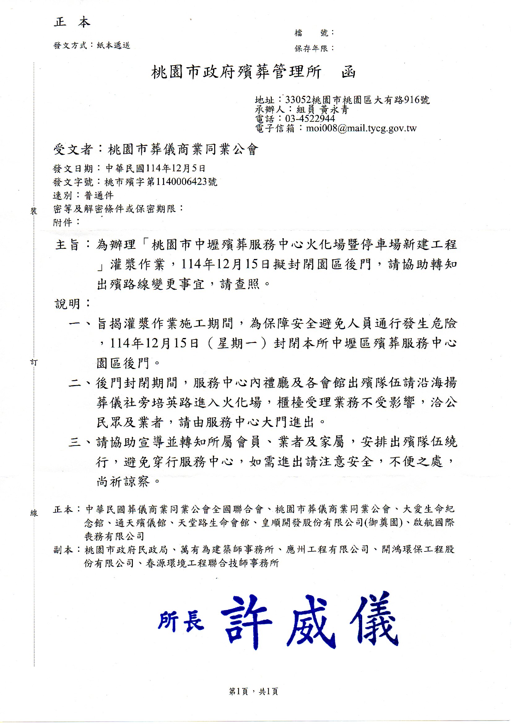 為辦理「桃園市中壢區殯葬服務中心火化場暨停車場新建工程」灌漿作業,114年12月15日擬封閉園區後門。