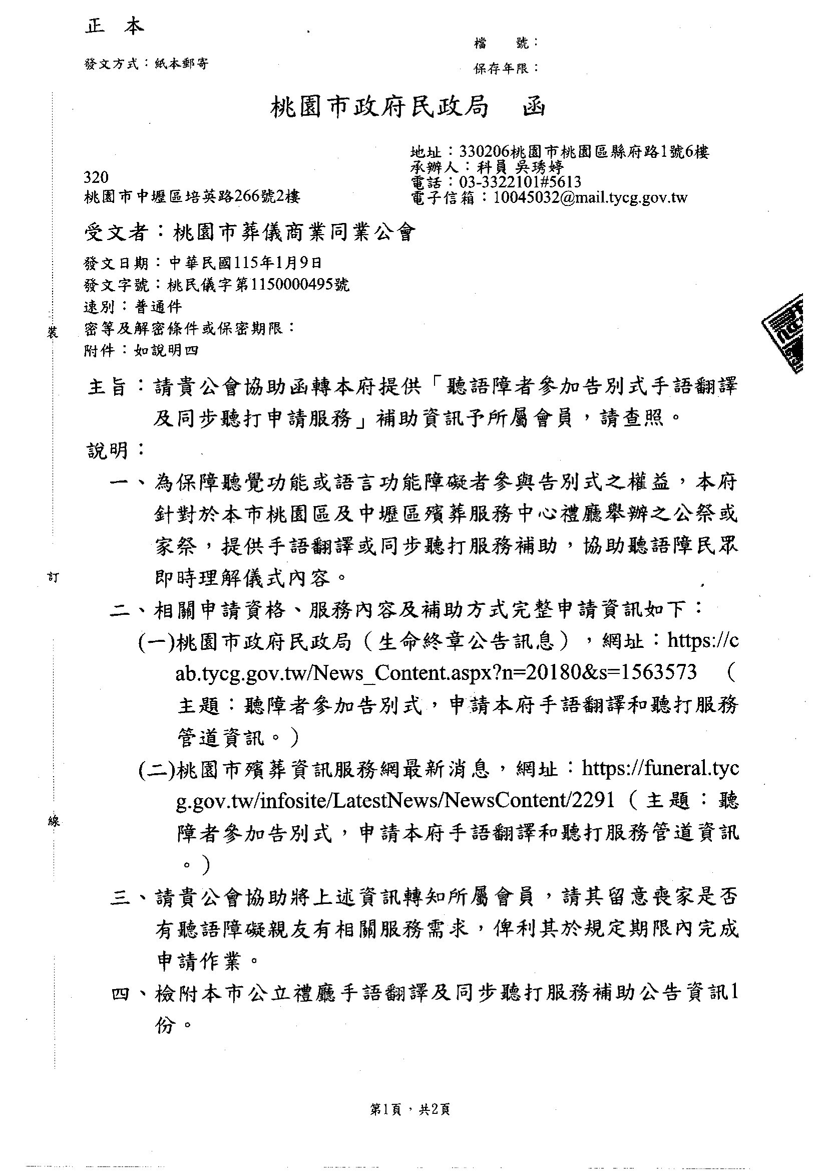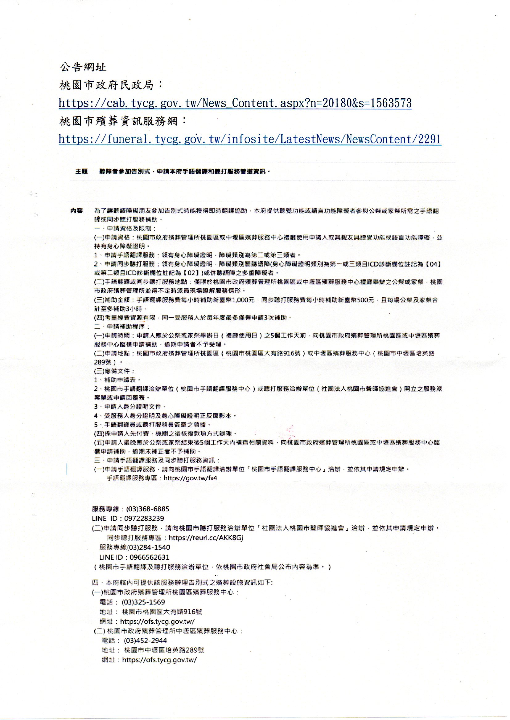 函轉桃園市政府民政局提供「聽語障者參加告別式手語翻譯及同步聽打申請服務」補助資訊。