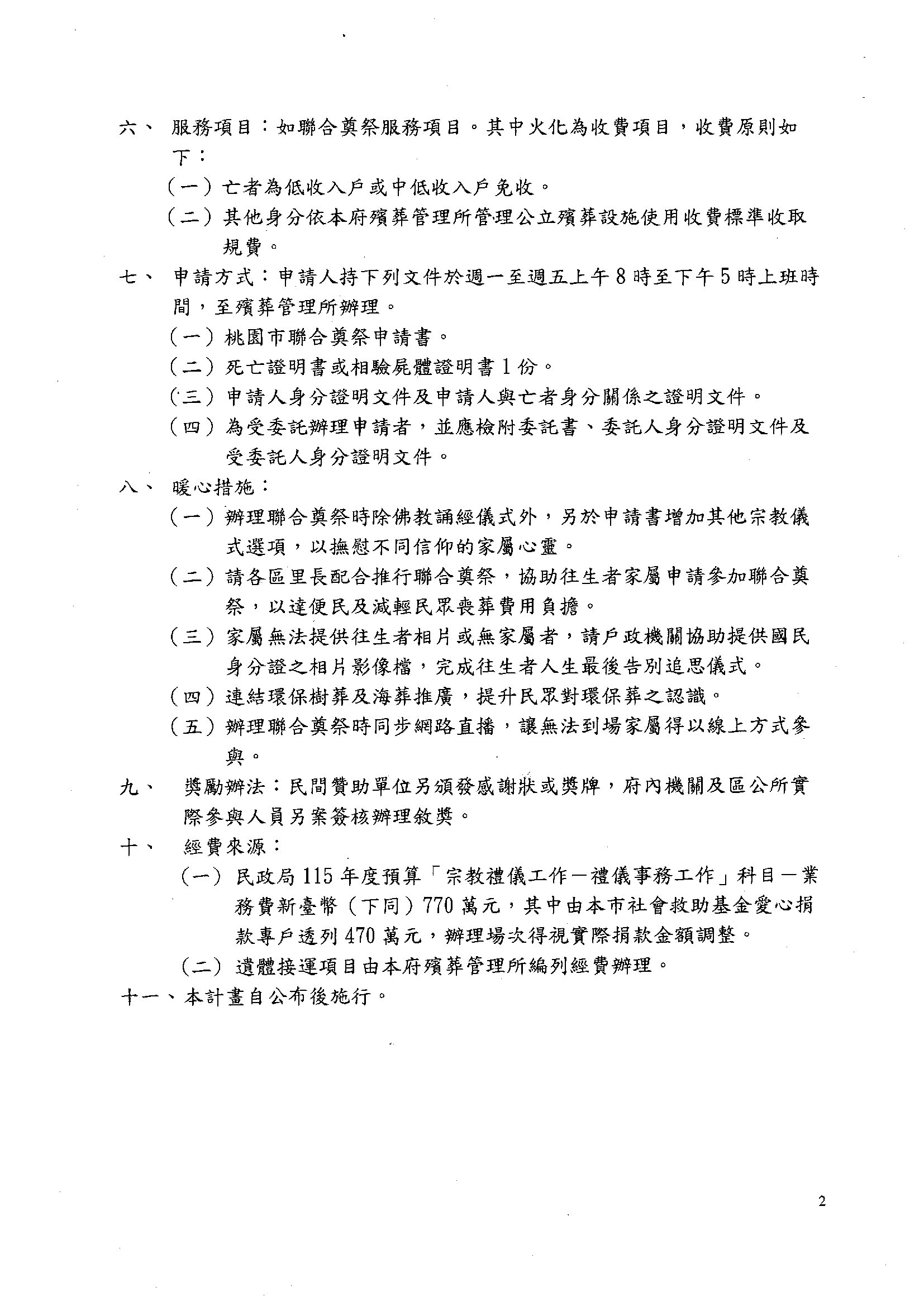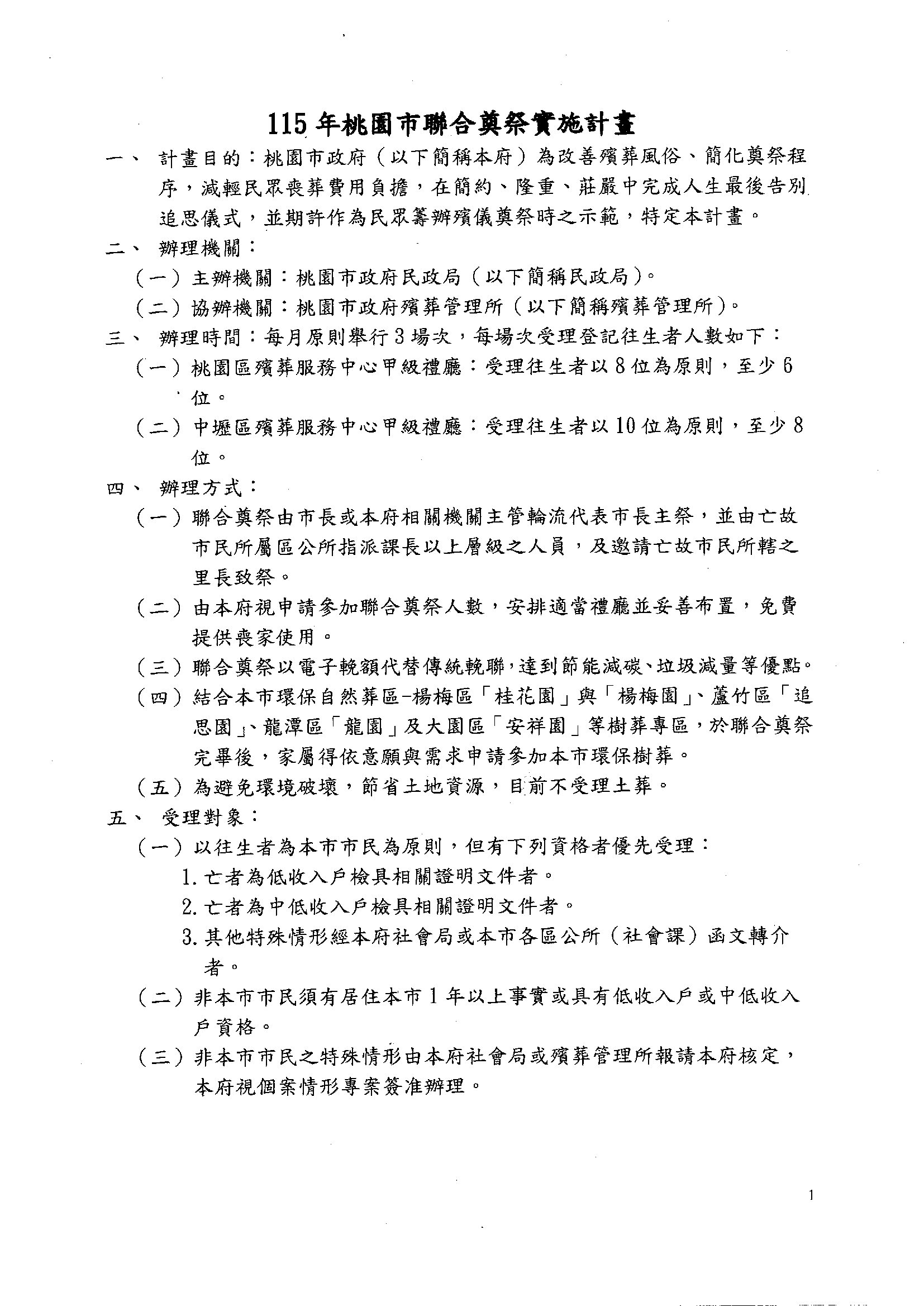 桃園市115年聯合奠祭將由靜心生命服務有限公司承辦,檢附115年聯合奠祭實施計畫及辦理日期一覽表各1份。