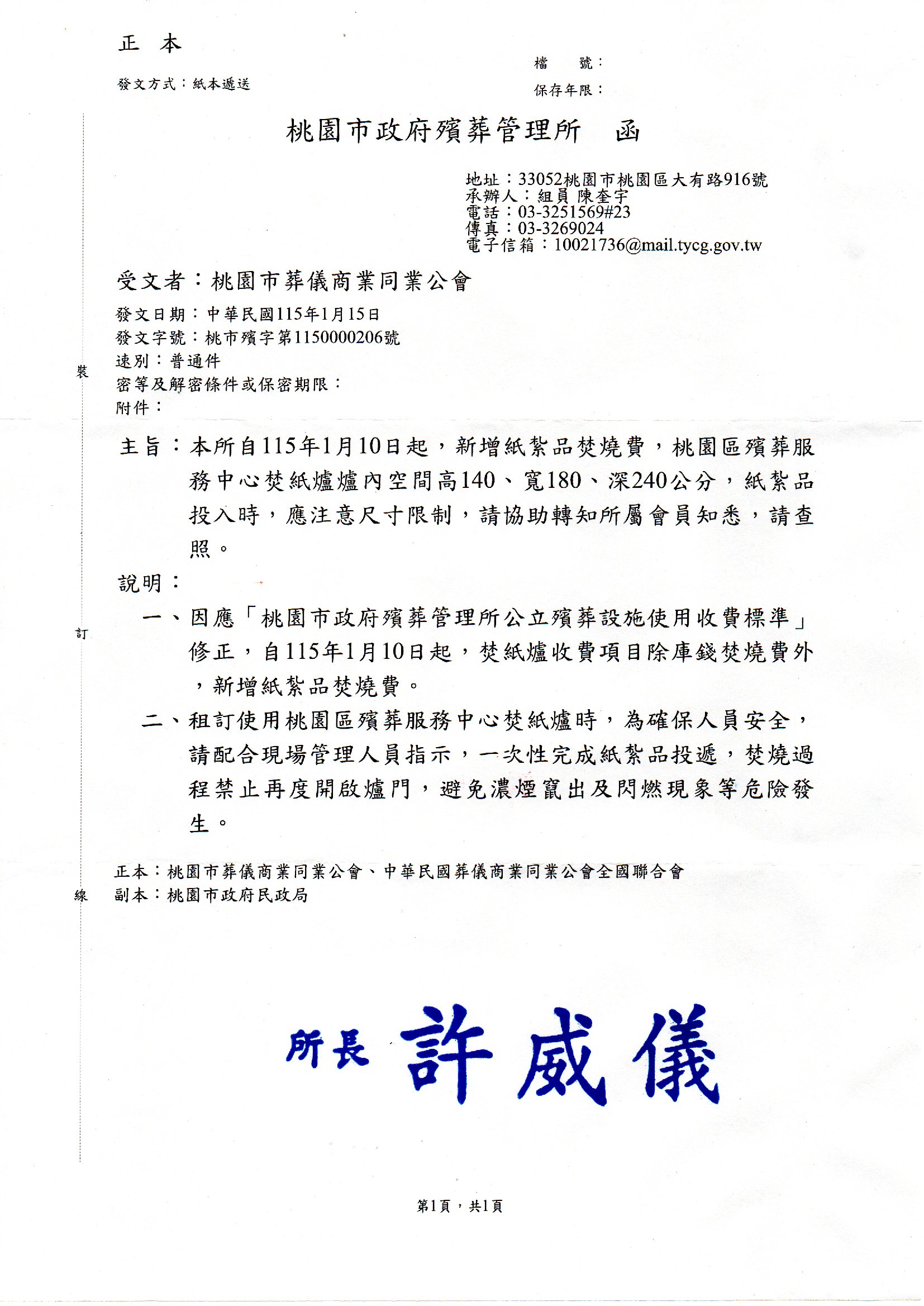 桃園市政府殯葬管理所自115年1月10日起,新增紙紮品焚燒費,有關桃園區殯葬服務中心紙紮品尺寸限制。
