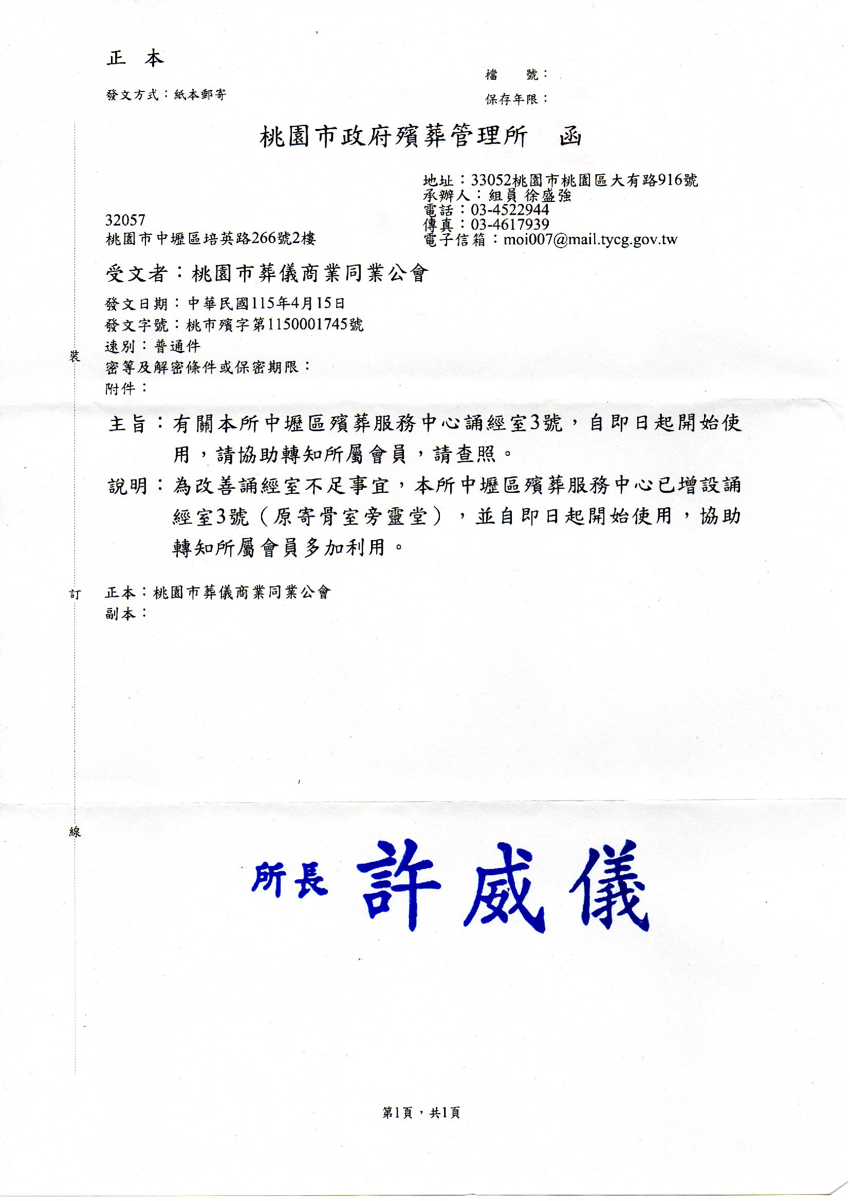 中壢區殯葬服務中心誦經室3號,自即日起開始使用。