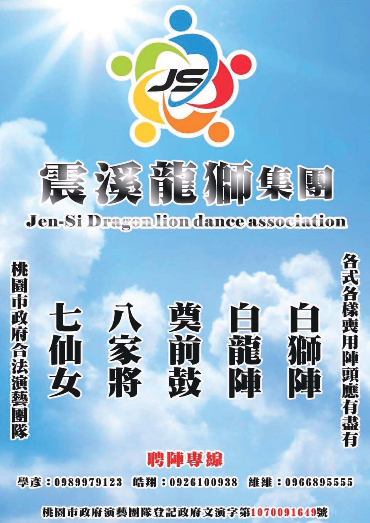 廣告贊助商 皇陽事業有限公司 大溪永福金寶塔(和平禪寺) 昌帝企業社 寶華山生命紀念館 御奠園淨界紀念會館 Les nuages拉諾彩虹 一天山生命紀念館 震溪龍獅民俗技藝團 孝澤園安靈會館 大溪金面山聖德名園 龍巖股份有限公司 芸祥佛堂 123