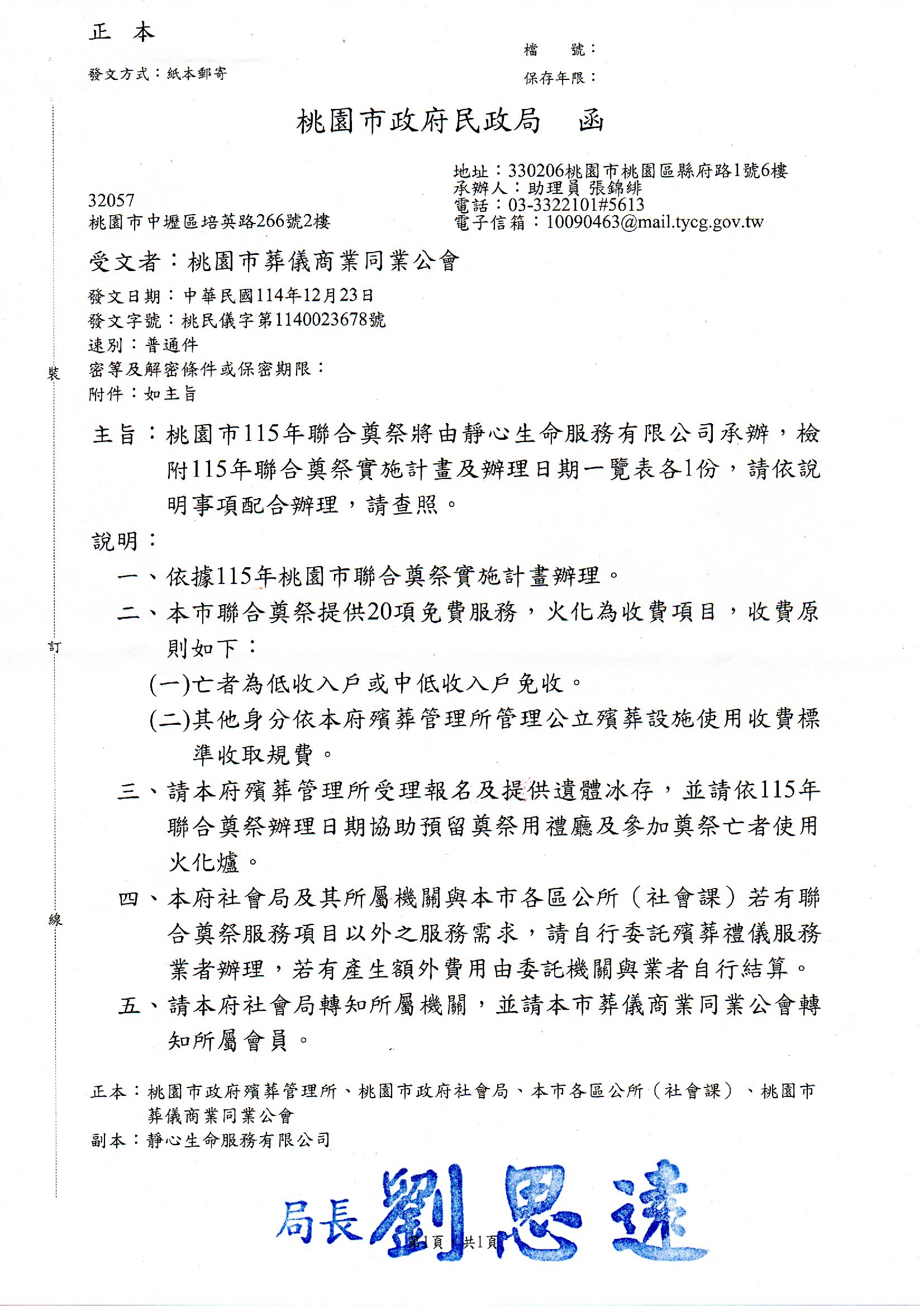 桃園市115年聯合奠祭將由靜心生命服務有限公司承辦,檢附115年聯合奠祭實施計畫及辦理日期一覽表各1份。