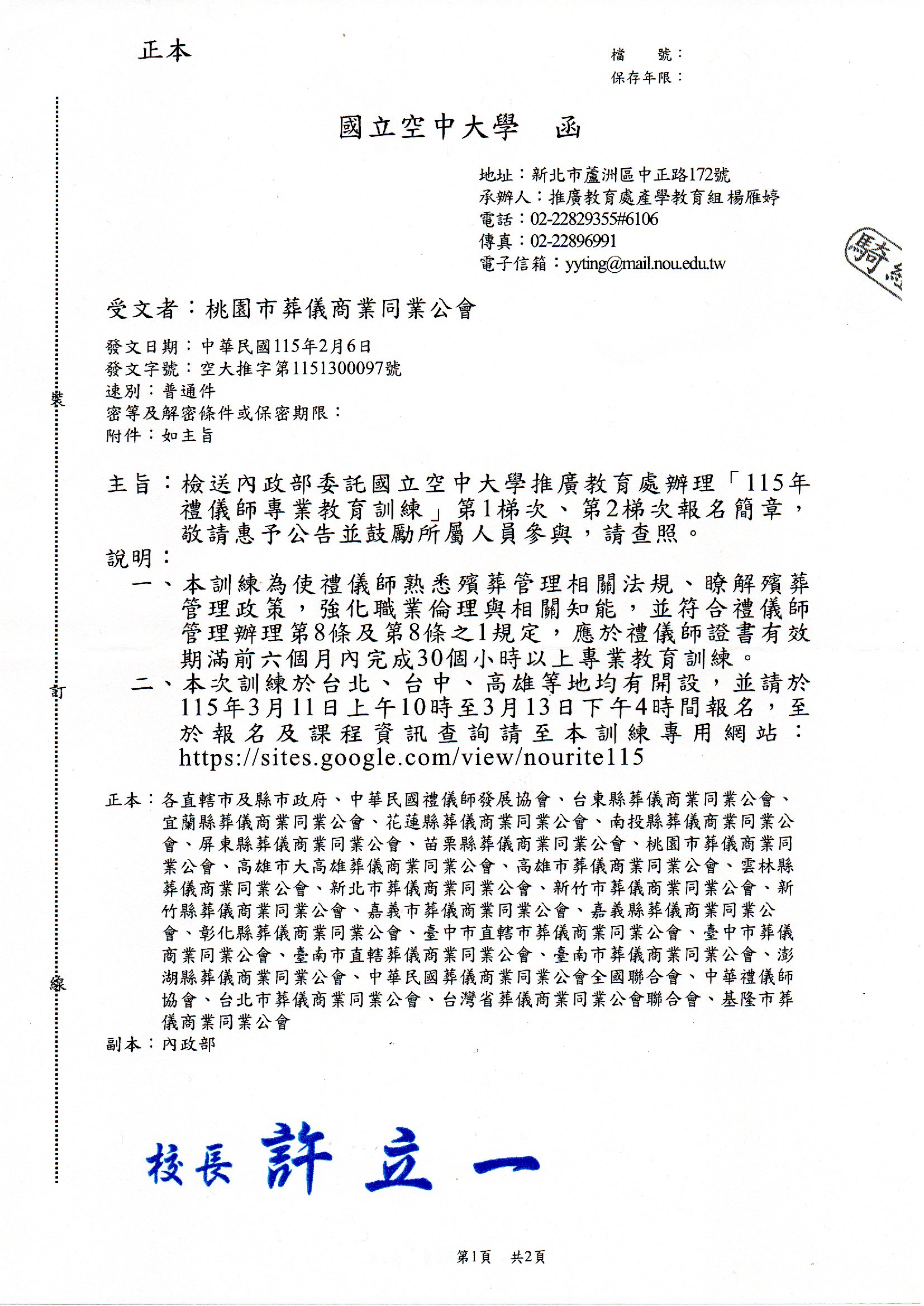 檢送內政部委託國立空中大學辦理「115年禮儀師專業教育訓練」第1、2梯次報名簡章。